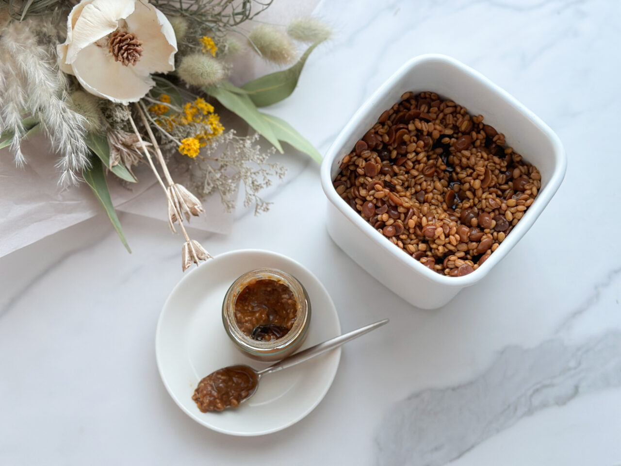 【レッスンで使う醤こうじ、レッスンで使う玄米粉、濃縮甘酒、グラシンカップ、容器】